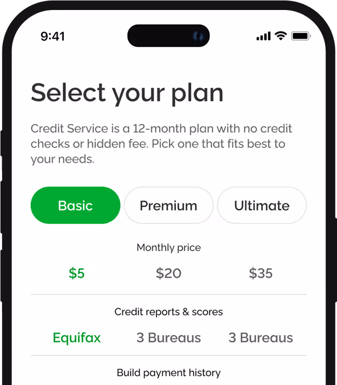Pick a plan that fits your goals, starting at $5/mo1. Make on-time payments to start building credit.